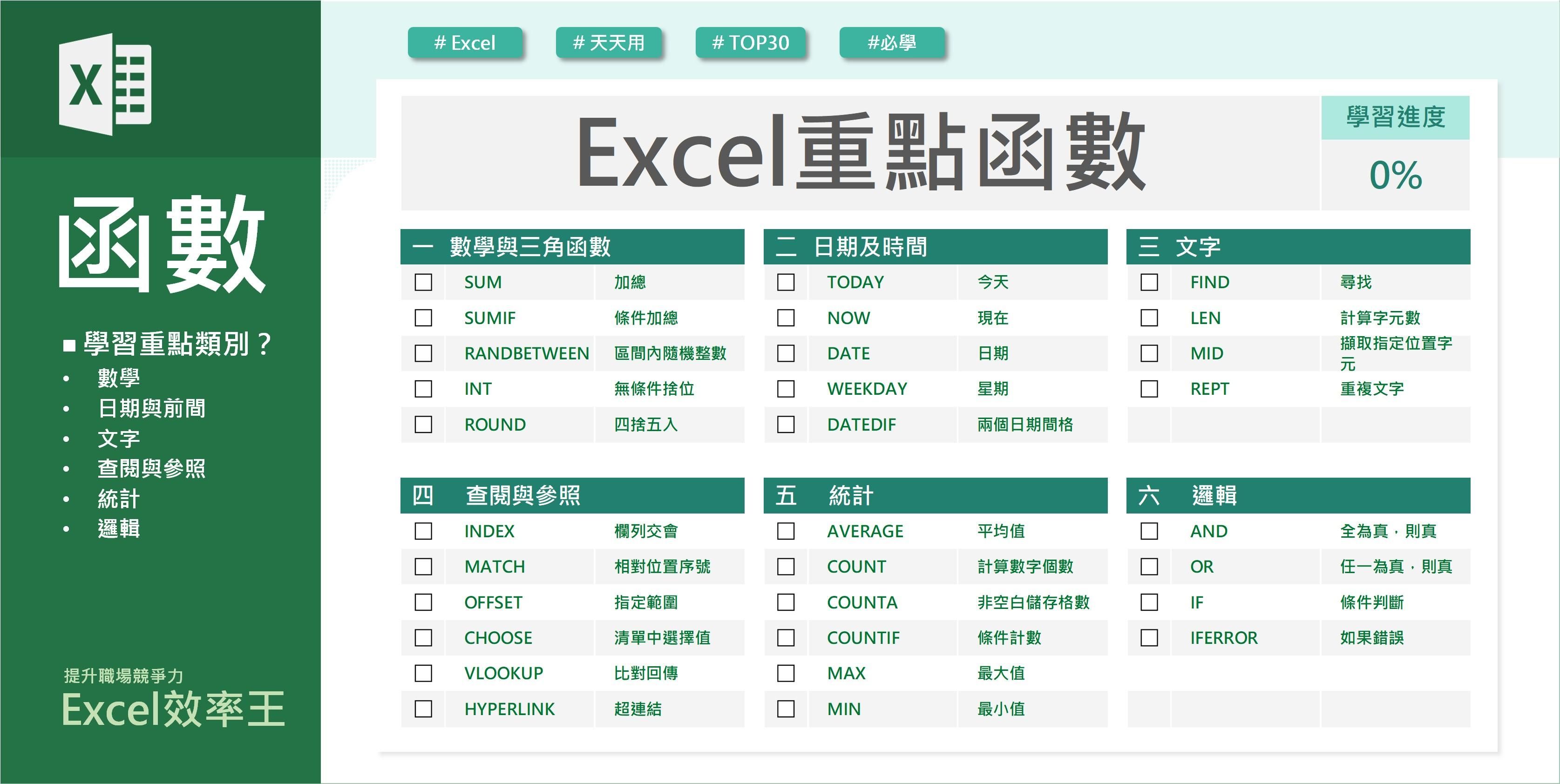 這本練習本挑選職場重要的30個函數,提供了功能、引數、使用的說明,並且附帶練習題,做過練習就能在你腦中建立印象,哪天需要的時候就可以快速派上用場。