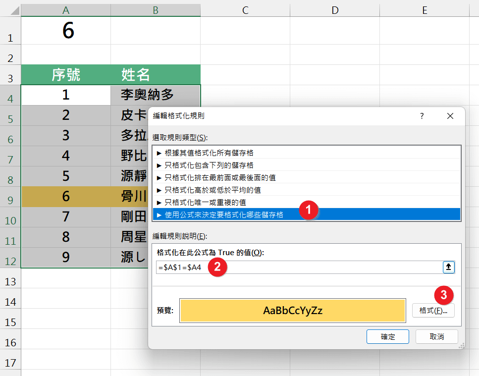 輸入公式=$A$1=$A4